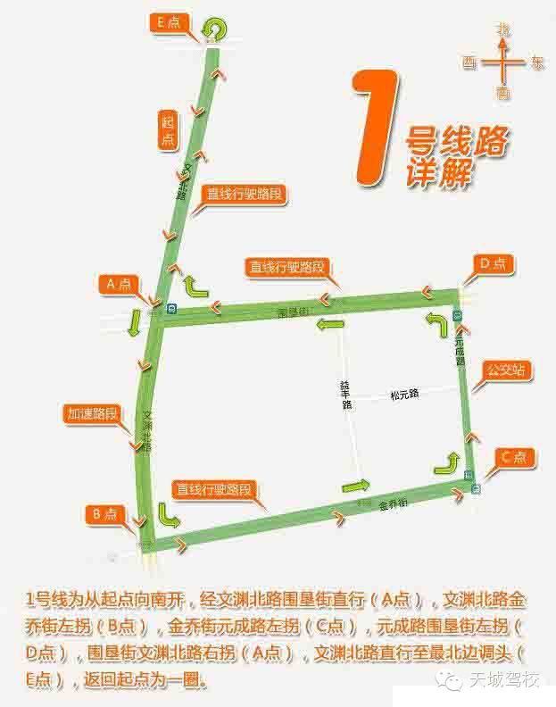 1號線為從起點向南開,經(jīng)文淵北路圍墾街直行(A點),文淵北路金喬街左拐(B點),金喬街元成路左拐(C點),元成路圍墾街左拐(D點),圍墾街文淵北路右拐(A點),文淵北路直行至最北邊調頭(E點),返回起點為一圈。
