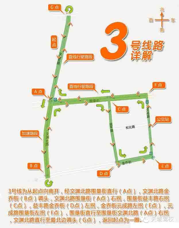 3號線為從起點向南開,經(jīng)文淵北路圍墾街直行(A點),文淵北路金喬街調頭(B點),文淵北路圍墾街右拐(A點),圍墾街益豐路右拐(C點),益豐路金喬街左拐(D點),金喬街元成路左拐(E點),元成路圍墾街左拐(F點),圍墾街直行至圍墾街文淵北路右拐(A點),文淵北路直行至最北邊調頭(E點),返回起點為一圈。